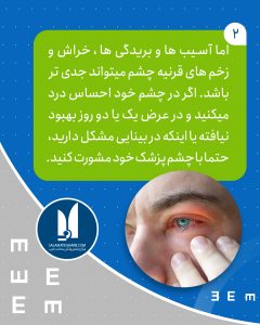 اما آسیب ها و بریدگی ها ، خراش و زخم های قرنیه چشم می تواند جدی تر باشد. اگر در چشم خود احساس درد میکنید و در عرض یک یا دو روز بهبود نیافته یا اینکه در بینایی مشکل دارید ، حتما با چشم پزشک خود مشورت کنید.
